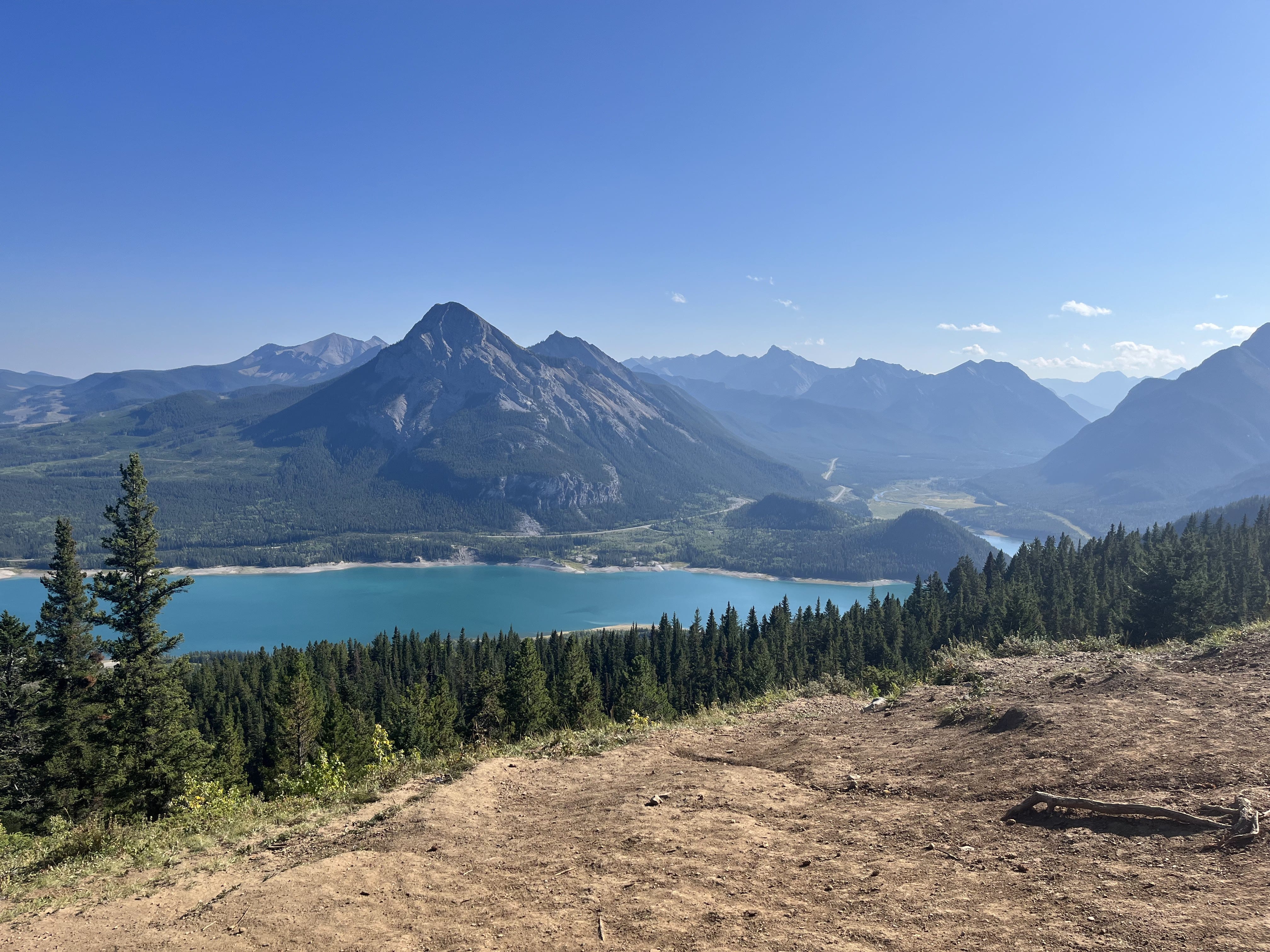 An ascent of the Prairie View Trail. Winding through forest before breaking out onto a rocky ridge, this trail offers a spectacular bird's-eye view of the turquoise Barrier Lake below and mountains in every direction. Activity snapshot:
